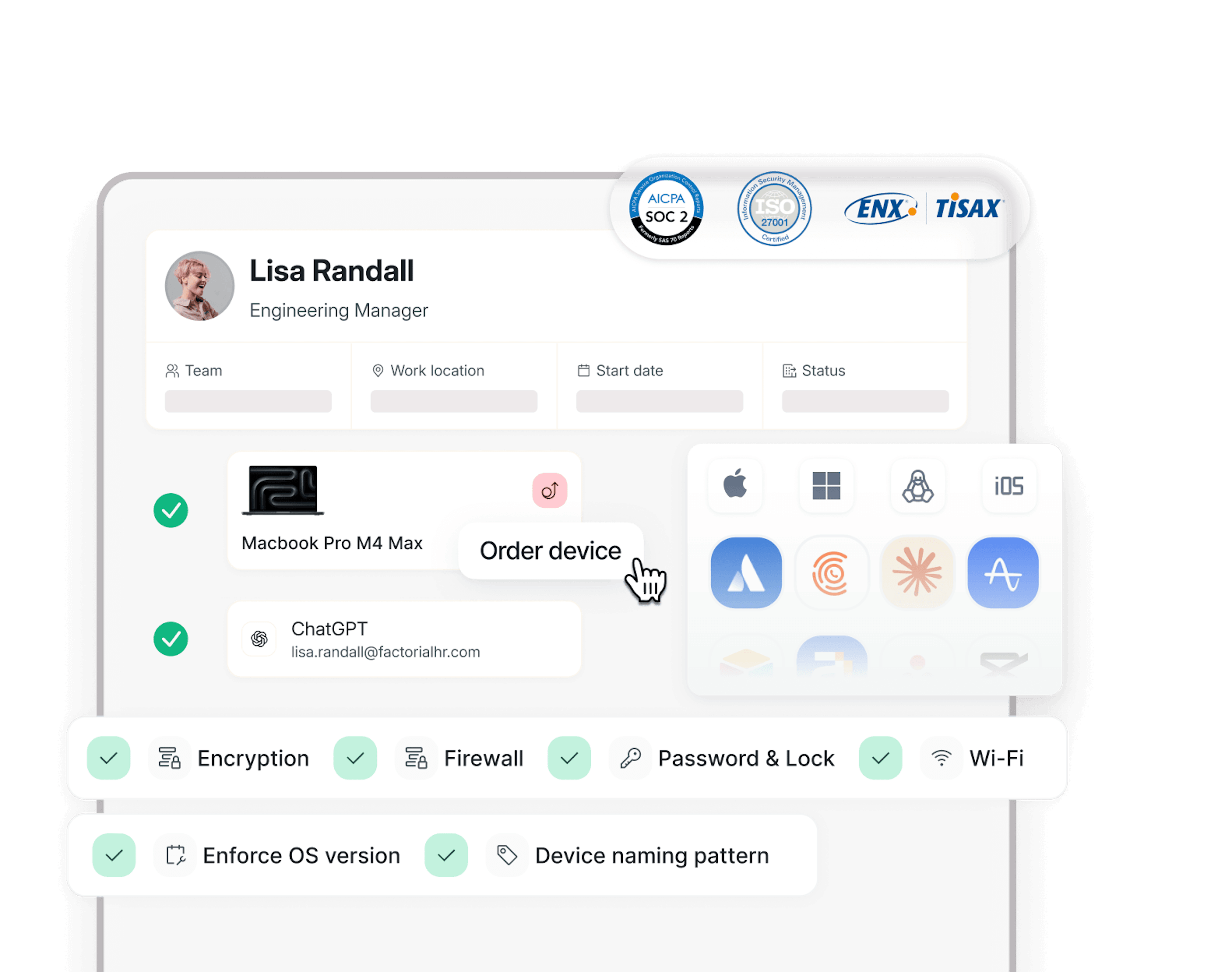 Factorial IT MDM is built for mixed fleets. You can manage company laptops, desktops, smartphones, and tablets across the major operating systems — macOS, Windows, Linux, iOS, and Android — with real-time inventory and device health in one place. See who’s using each device, whether it’s compliant, and take action remotely when needed.